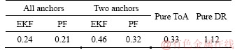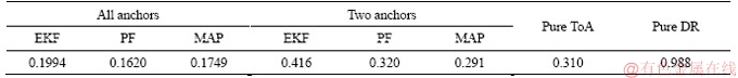 Table 1 summarizes the mean distance errors of various schemes in Path 1. Obviously, pure DR approach has the largest mean distance error. The mean distance errors of proposed algorithms are all less than the one of pure ToA method when all the anchors are used. Even if only two anchors are utilized, the mean distance error of MAP algorithm is less than the one of pure ToA method.Meanwhile, the mean distance error of PF is close to the one of pure ToA method.