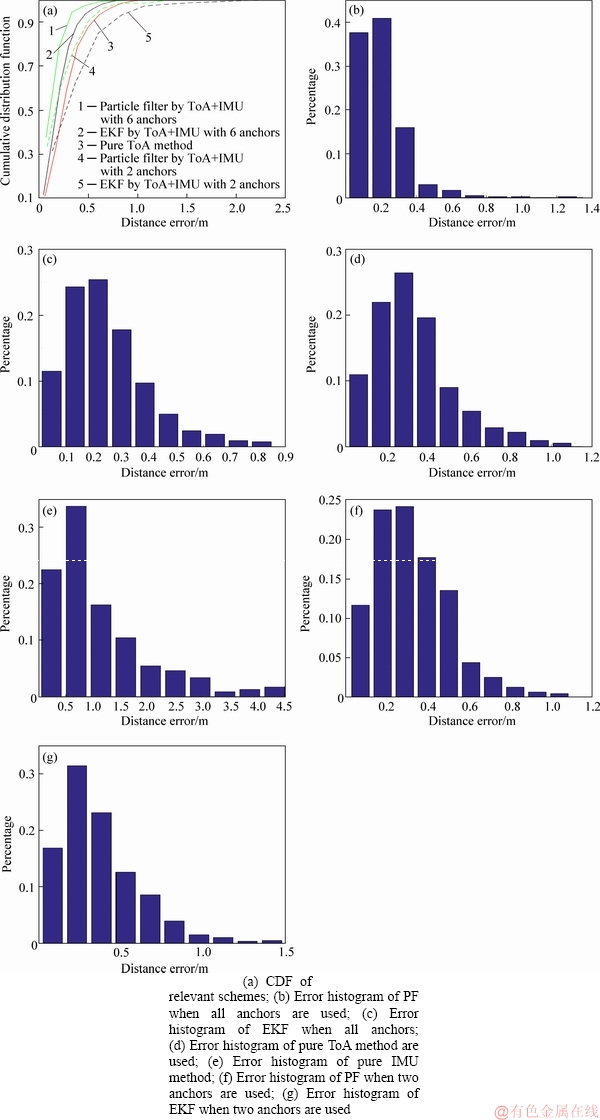 Figure 8(a) illustrates the cumulative distribution functions of all relevant schemes. No matter how many anchors are used, hybrid method by particle filter performs better than hybrid method by EKF. And even when only two anchors are used, hybrid method by PF exhibits slightly better performance than standalone ToA system.Figures 8(b), (c) respectively present the error distributions of PF, EKF algorithms while all the anchors are used. Though the largest distance error of PF is bigger than the one of EKF, PF still performs better as the distance error is mostly in the range [0, 0.2]m while the distance error of EKF is distributed more uniformly between 0 m and 0.6 m. As for standalone ToA system, most of the distance errors lie in the range [0, 0.8]m as shown in Figure 8(d). As for standalone DR system, as depicted in Figure 8(e), the maximum distance error can even be 4.5 m. Most of the distance errors lie in the range [0, 3]m while the error is concentrated around 1 m. Figures 8(f), (g) respectively illustrate the error distribution of PF and EKF while only two anchors are utilized. Comparing Figures 8(f) with (b), (g) with (c), obviously, if the number of anchors utilized is reduced, the performance of both the algorithms deteriorates. However, comparing Figure 8(d) with (f), we can find that the error distribution pattern of hybrid method by PF with two anchors is similar to the one of standalone ToA method, which means that the performance of these two schemes are close to each other.
