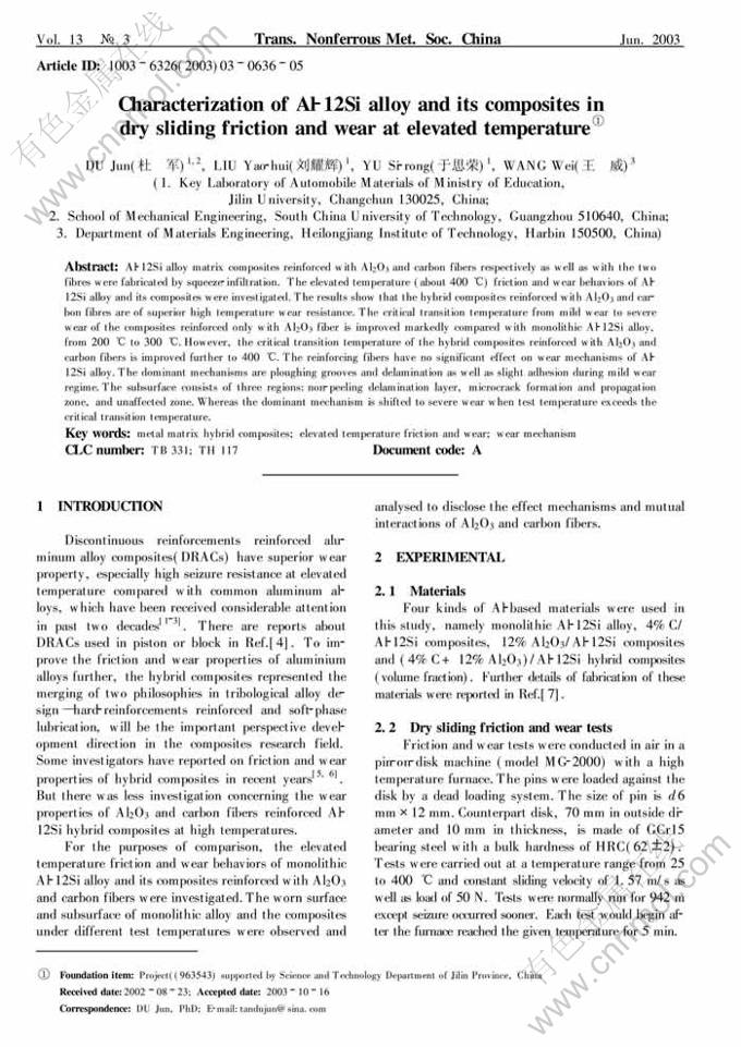 Key words:metal matrix hybrid composites;elevated temperature friction and wear;wear mechanism