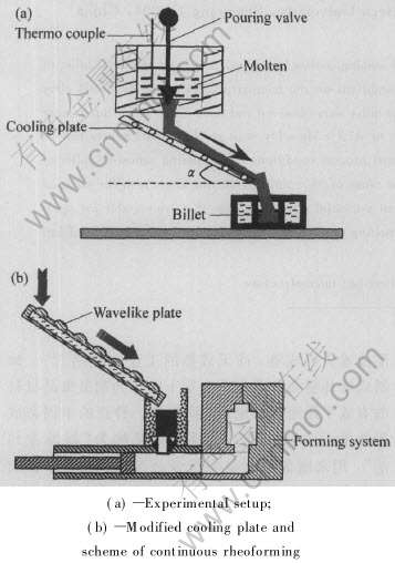 半固态成形技术已有30多年的历史了, 其应用领域也不断扩大。 在国外, 流变与触变成形工艺已经成功应用于汽车和航空航天零件的生产, 并逐步应用于电子与电器结构部件的生产[1-4]。 虽然从20世纪80年代开始我国开始投入力量对半固态金属流变学理论及铸造工艺进行理论与应用进行研究, 取得了许多重要成果。 然而, 在我国半固态成形技术仍不成熟, 尚无成熟的工业化应用[3-10]。 倾斜式冷却剪切技术在冶金学上曾作为制备细晶材料的有效手段而被讨论过, 而作为一种新的半固态成形技术近年来才被人们重视, 又称为“斜坡冷却法”, 用来制备铝合金与镁合金半固态浆料。 目前该技术在日本已经初步实现了铝合金薄带的流变轧制, 并且在欧洲已经申报了发明专利[11-14]。 它具有工艺简捷, 设备成本低廉, 易于实现, 可制备高熔点半固态材料的特点, 有望解决半固态成形的工业化应用以及高熔点半固态浆料的制备等问题, 具有重要的研究意义。 本文作者自行设计实验装置, 对斜板进行了改进, 采用带有波浪形表面的倾斜板进行实验, 对倾斜式冷却剪切技术制备Al-3%Mg半固态合金坯料进行了探索, 并对二次加热工艺及二次加热组织及触变成形性能进行了研究。