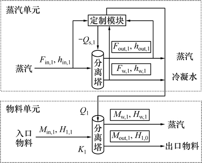 蒸汽单元:新蒸汽进入蒸发器后一部分液化为水进入冷凝水罐,剩余的2次蒸汽进入2效蒸发器,产生热量Qs,1,传递给物料的热量为Q1。用分离塔可以模拟这个过程,如图2所示。分离塔是一种将塔内物质实现理想的气液接触,并将气体与液体实现物理分离的单元操作。