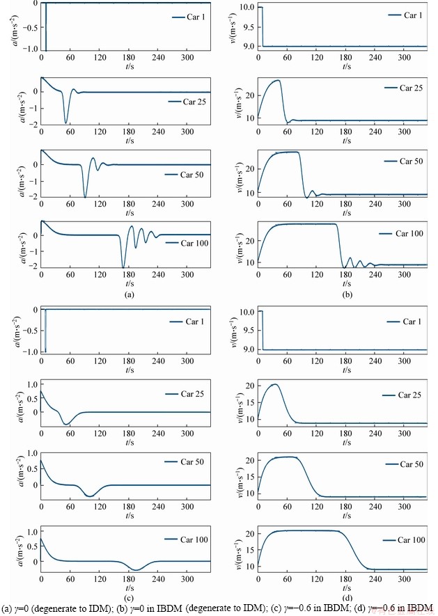 The results of scenario 1 are shown in Figures 2 and 3. Figure 2 shows the acceleration changes of the platoon when γ=0.1, γ=0, γ=-0.2, γ=-0.6. It can be seen in Figures 2(a)-(c) that the overall shape of the acceleration curve is diffusive, which means that the acceleration curves of vehicles fluctuate through time. And the fluctuation is more serious when the vehicle nears the tail of platoon. It reveals that the small disturbance propagates and amplifies along with the platoon, and the traffic flow is unstable in all of three cases. However, it can be found that the degree of amplification decreases with the decrease of γ, which means that the stability is improved with the decrease of γ. When γ descends to -0.6, the traffic flow is stable, as shown in Figure 2(d). Thus the string stability can be improved with the decrease of γ in the IBDM. To observe the rule more clearly, Figure 2(d) displays the acceleration curves of four vehicles along with the platoon. In the case, the acceleration curve is convergence to a certain extent, and the fluctuation degree reduces along with the platoon, which can be seen in Figure 3. Figure 2(e) shows the acceleration changes of the platoon in scenario 1 when γ=-0.6 in L-IDM. It can be seen that the disturbance got smaller through the platoon, but is larger than that in Figure 2(d). So the ability to eliminate the disturbance of IBDM is better in that case.