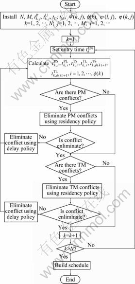 Step 6: If there is any recourse conflict caused by the capacity constraints of transport module, then regulate the schedule to eliminate conflicts and compute results according to Eqs. (16)-(20) and (23)-(24).