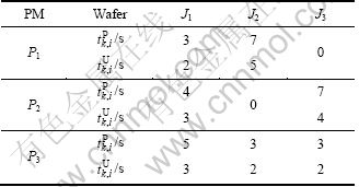 A simple example is used to illustrate the process of the algorithm, especially the two policies. Set M=3, N=3, tC=1 s and tM=1 s. Processing times and most permitted residency times are listed in Table 1.