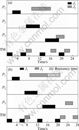 Fig. 3 Residency policy: (a) Basic schedules of J1 and J2; (b) Schedules of J1 and J2 based on residency policy