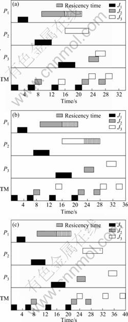The scheduling process of J3 is shown in Fig. 4. There are conflicts at P3. If the residency policy was applied to eliminating them, J3 required 5 s residency time at P2. However, the most permitted residency time is 4 s in fact. Thus, the delay policy was applied then. The schedule result is shown in Fig. 4(c) as well.