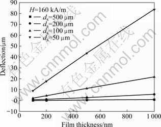 同样在衬底厚度远大于薄膜厚度的条件下,通过有限元软件在外磁场为160 kA/m下选取4种不同厚度的薄膜,在固定的薄膜厚度条件下,改变衬底厚度模拟分析衬底厚度对端点挠度的影响,其结果如图3所示。模拟结果表明:端点挠度与衬底厚度近似成二次抛物线关系,这与式(3)中薄膜及衬底厚度与悬臂梁自由端挠度值的关系相吻合。