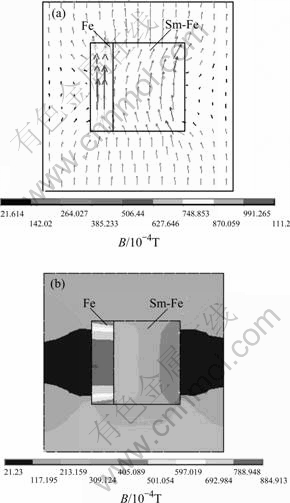 采用ANSYS 软件对Sm-Fe薄膜及Sm-Fe/Fe复合膜的内部磁场进行模拟,分析Fe膜的加入对磁场的影响。采用的单元类型为PLANE53单元模型。参数的选取如下:盖玻片衬底的磁导率为1,Fe膜的磁导率为18 000,Sm-Fe膜的磁导率为4 000(由磁化曲线得出)。模拟过程中假设磁化时薄膜的磁导率恒定不变。