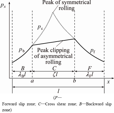 Figure 2 shows the distribution of the rolling pressure along the contact arc for asymmetric rolling. The lengths of the contact region, the backward slip zone, the cross shear zone and the forward slip zone are denoted as l, λBl, ζ l and λFl, respectively.