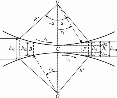 where q refers to the rolling pressure. Considering the geometry of the setup, the deformed zone of the foil can be divided into a left interval ranging from 0 to -α and a right interval ranging from 0 to +α. If the foil thickness is higher than the minimum value hmin, the entry thickness is denoted as hM, and the exit thickness is denoted as hout, which is equal to the sum of the actual roll gap hs after elastic deformation and the elastic recovery of the foil 2Δ2, i.e., hout=hs+2Δ2. In this case, as shown in Fig. 3, |-α| ≠ |+α|. In contrast, under PMRT conditions, |-α| = |+α|.