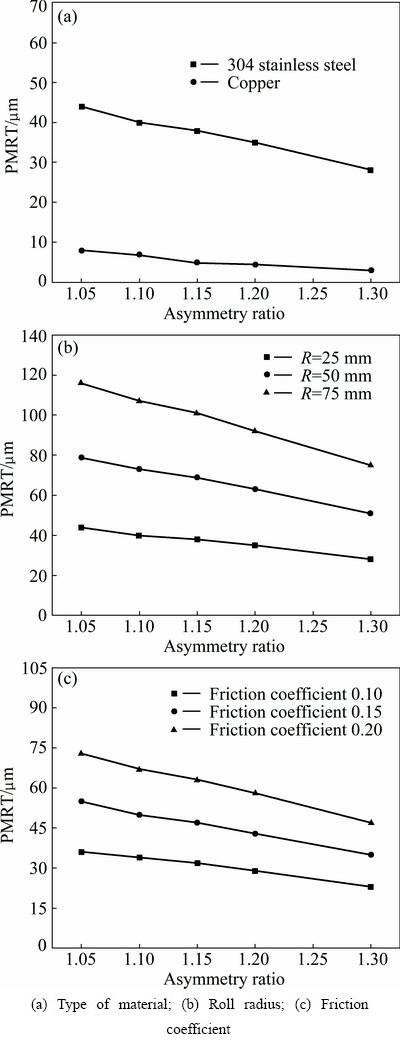 The results presented in Fig. 4(b) were calculated based on the following assumptions: 1) the proportions of the forward slip, the backward slip and the cross shear zones were assumed to be constant for the same asymmetry ratio; 2) the roll force was fixed at 50 kN; 3) μ=0.12, K=243 MPa (for 304 stainless steel). According to the results, the smaller the roll radius, the thinner the PMRT of the metal foil. Furthermore, with increasing asymmetry ratio, the decline rate of the PMRT curve is reduced as the roll radius decreases.
