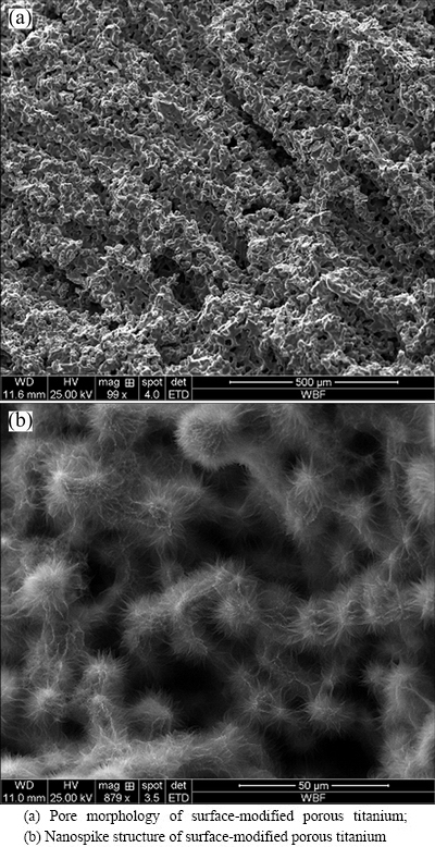 When the volume fraction of titanium powder in slurry was set to be 10% and the porous specimen was sintered at 1200 °C for 1 h, the porosity, pore diameter, compression strength and elasticity modulus of the porous specimen were (58.32±1.08)%, (126.17± 18.64) μm, (58.51±20.38) MPa and (1.70±0.52) GPa, respectively. SEM image (Fig. 1(a)) showed that the morphology of porous titanium was radially distributed and concentrated in the middle of the cylinder. As shown in Fig. 1(b), nanospikes were evenly distributed on the pore wall surface after thermal oxidation treatment. The size of the nanospikes developed on the substrate of the pore wall was about 200 nm.