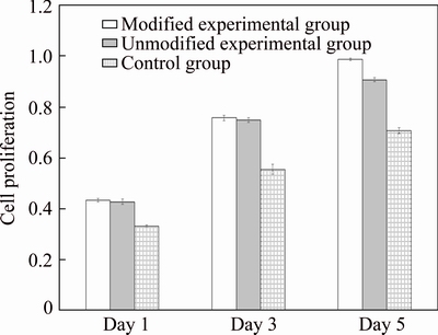 Porous titanium specimens in the modified and unmodified experimental groups, as well as dense titanium specimens in the control group, were transferred into 24-well culture plates after sterilization and drying. Each group contained three parallel samples. RPMI- 1640 culture medium (500 μL) containing 10% fetal bovine serum (FBS) was added into each well. After hydrating the specimens for 24 h, the culture medium was discarded followed by gently rinsing the specimens twice in phosphate buffered saline (PBS). Trypsinized and passaged human MG63 osteosarcoma cells were diluted to a density of 1×104 cells/μL per well, and the cell suspension was slowly transferred dropwise into each well on the specimen surface, followed by incubating at 37 °C in an incubator containing 5% CO2 and 95% humidity for 8 h. Once the cells began to grow, 1 mL culture medium was added slowly into each well. The cells were further incubated with the medium changed once every two days.
