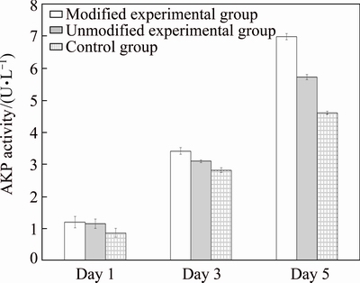 Fig. 3 AKP activity measured at different time after co-culturing of cells with different implant materials
