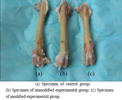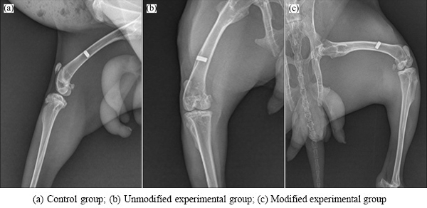 X-ray examinations after postoperative 4 weeks revealed no sign of bone dissolution or X-ray translucent areas in the implants of the two experimental groups and the control group. No obvious gap, but rather close integration, was found between the implants and adjacent bones. However, no significant signs of osteogenesis were found at the early stage of bone healing. X-rays taken after postoperative 8 weeks showed no significant changes in the dense titanium control group compared to 4 weeks; however, the integration between the modified and unmodified porous titanium and the implant-adjacent tissues was closer with new bone formation at 8 weeks compared to 4 weeks. Results after 12 weeks (Fig. 5) showed no loosening or bone resorption between these three groups of implant materials and their adjacent bone tissues. Bone density adjacent to implants of the modified and unmodified experimental groups was increased, but no significant increase of new bone mass was found.