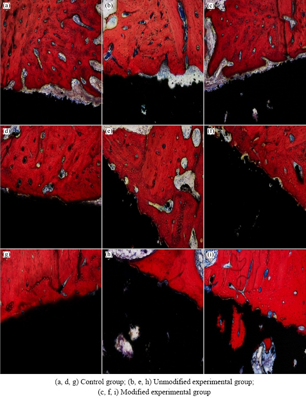 The morphology of the bone-implant interface has been used as the standard for evaluating osseointegration. In current studies on bone-implant interfaces, cutting/ grinding-based histological sectioning on undecalcified hard tissues is often used to prepare sections for analysis of bone formation, deposition and absorption. In the present work, light microscopy of Van Gieson’s stained hard tissue sections revealed connective tissues in blue, mature bone and trabecular bone in red, and peripheral tissues before calcification in purple. The results of morphological analysis are shown in Fig. 4. Van Gieson’s staining after postoperative 4 weeks showed the presence of a gap at the interface between the dense titanium implant and adjacent bone tissues, with blue connective tissues filling the inside of the gap (Figs. 6(a), (b) and (c)). Gaps were found in some regions between the porous titanium implants and bone tissues in the two experimental groups, with new bone tissue deposition and continuous growth from the bottom of the gap and bone wall surrounding the gap to the implant surface. Blue connective tissues growing into the pores were observed. Van Gieson’s staining after postoperative 8 weeks (Figs. 6(d), (e) and (f)) showed the disappearance of the gap at the interface between the dense titanium implant and adjacent bone tissues with close bone tissue integration. No other tissue filling was found at the bone-implant interface. The porous titanium implants of the two experimental groups were closely connected to their adjacent bone tissues, and the gaps were completely repaired by new bone tissue. No other tissue fillings were found at the bone-implant interfaces. The new bone tissue was gradually rebuilt, lamellar bone formed, and blue connective tissues were found to grow into the pores. After postoperative 12 weeks (Figs. 6(g), (h) and (i)), mineralization began to appear in some bone tissues adjacent to the dense titanium implant in the control group, with some areas showing vascular proliferation. In the porous titanium experimental groups, most of the bone-implant margin disappeared, mature bone plate tissues were found around the implants, and the bone growing into the pores began to mature and mineralize. The above findings suggested that the porous structure and surface nano-modification of implants affected the bone ingrowth. Bone deposited inside the pores of implants with surface nano-modification had more mature differentiation than that of unmodified implants, suggesting that the nanostructures promoted bone ingrowth and differentiation of osteoblasts, which might be associated with the physiological micro- vascularization inside the pores at the late stage. WILLIE et al [17] and CHRISTENSON et al [18] suggested that a moderate to late stage of osteogenesis and its stability are associated with vascularization, which is mainly affected by pore morphology and connectivity. Due to the complexity and variations of in vivo environments, factors affecting bone ingrowth due to nano-modification are relatively complex; therefore, further investigation and clarification of its direct impact factors will be necessary.