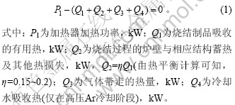 硬质合金烧结炉的热平衡计算分为真空加热期、低压Ar加热期、高压Ar加热期以及高压Ar冷却期等4部分,其目的是计算每个阶段硬质合金烧结炉的加热功率曲线、计算甲烷与Ar流入流量和热炉气流出流量、高压Ar冷却期冷却水流量等。热平衡计算的前提为: