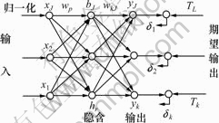 采用目前最流行、应用最广泛的神经网络模型之一是BP网络[11-12]。BP网络又称感知机似的层状神经网络 (Perception-like layered neural network),多层感知机(Multi-layer perception),前馈式神经网络(Feed-forward net)或误差信号反传网络(Error back-propagation net)。适用于多层网络的误差反传学习算法是Rumelhant等发展了感知机式的神经网络,在许多实际应用中获得了成功。层状网络有输入层、隐层、输出层,隐层可为1层或多层,信息由输入层输入,经隐层由输出层输出。其结构模型如图2所示。通过筛选出优良的历史样本,进行样本除噪、平滑等预处理,利用统计模式识别方法确定优化信息,利用神经网络强非线性表达能力来拟合系统状态参数和需要决策的参数之间的映射关系,来作为优化操作参数的混沌遗传算法的适应度函数,其步骤为:采集样本,数据预处理,通过分类图寻找优化信息,核对优化信息,确定神经网络输入变量,通过自学习获得神经网络的权值。
