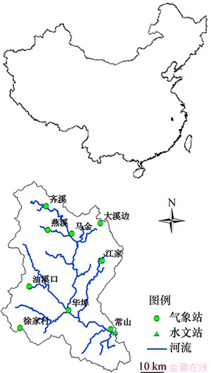 常山港流域位于钱塘江流域上游地区,流域面积为2 381 km2,如图1所示。流域属亚热带季风气候区,气候温暖湿润,流域内水汽充足,雨量丰沛。流域地形特征为山地多平原少,地势西高东低,流域内水系发达,大小支流60多条,降水量和径流量年内分配不均,主要集中在4~9月份。流域内洪水汇流速度快,历时短,洪水年际变化大,沿岸洪涝较为频繁,严重制约了本区社会经济的可持续发展。
