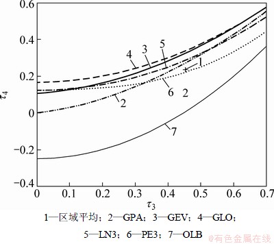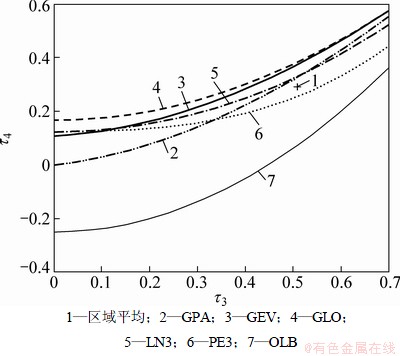 提取常山站的年最大日径流序列,使用线性矩方法进行频率分析。线性矩方法在Greenwood定义的概率权重矩[19]基础上发展而来,首次由Hosking等[20]提出,是一种应用越来越广泛的参数估计方法,根据线性矩原理,计算径流序列的线性矩系数τ3(偏态系数)和τ4(峰态系数),得到τ3=454,τ4=0.233 4,利用线性矩图[21]原理判断较为符合的分布函数,线性矩图利用样本线性矩系数τ3和τ4与分布函数的线性矩系数τ3和τ4的相关程度来判断分布函数的类型,即如果某一分布函数的线性矩系数和区域性矩系数相一致,则该分布函数为最优分布函数,根据常山站流量序列的线性矩特征值做线性矩图如图3所示。