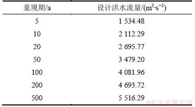 GPA代表广义柏拉图分布,GEV为通用极值分布,GLO为广义罗切斯特分布,LN3分布为3个参数对数正态分布,PE3代表皮尔逊Ⅲ型分布,图3中样本线性矩特征值接近PE3分布,选择PE3分布作为年最大日径流量序列的分布函数,根据参考文献[22]中的设计洪水计算公式,计算各重现期的设计洪水,如表1所示。