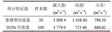 根据常山港流域2020s面雨量和日平均气温的降尺度计算结果,使用Hargreaves经验公式计算面平均蒸发量,利用实测期的参数率定结果模拟未来时期常山站的日径流量。模拟结果的统计特征值如表3所示,将基准期年最大日径流量序列的统计特征值同列于表2。从表2可看出:2020s流量序列的最大值、均值和方差均小于基准期,其中均值的差别最为明显,表明未来一段时期内常山站的出口径流量有减小趋势。比较基准期和2020s的面雨量和蒸发量可知,2020s内常山港流域面雨量有增大趋势,年最大日雨量的平均值增大15.9%,同时蒸发量也有增大趋势,年最大日蒸发量的平均值增大4.2%。