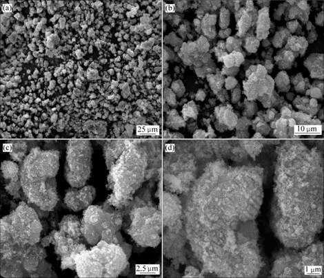 图4所示为不同放大倍数下氧化镍样品的扫描电镜照片。从图4可以看到,样品由比较规整的近球形颗粒组成,颗粒分布均匀,平均颗粒大小为1~3 μm。在放大倍数较高(如图4(c)和(d))时,可以明显地看到,大颗粒表面吸附了很多纳米级的小颗粒,形成团聚体,这是由于小颗粒比表面积大,表面自由能高,结构不稳定,容易相互团聚在一起形成大颗粒或者吸附在大颗粒表面,以降低其表面能。