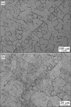 从图1(a)可以看出:TB8钛合金在经(α+β)/β转变温度以上固溶处理后,合金显微组织为单一的β晶粒,晶粒度为6~7级。