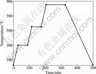 The composites were fabricated by the powder metallurgy technique. The powder of copper (99.9% purity) and treated CNTs were mixed and milled for 5 h with the same planetary ball mill machine. After mixing proportionally (0, 5%, 10%, 12%, and 15% in volume fraction of CNTs), the powder mixture was cold pressed at 200 MPa, sintered, cold pressed at 600 MPa, and sintered again finally. Figure 1 shows the sintering process. For comparison, parallel specimens made from the mixture of pure copper and graphite powder (98% purity) were consolidated under the same conditions applied for CNTs-Cu composites. The microstructure images of copper matrix composites containing 10% graphite and 10% CNTs are separately shown in Fig. 2. It can be found that the CNTs appear dispersive and are fully embedded in the copper matrix. The sintered materials were machined into the specimens of d10 mm×25 mm to be fit into the sample holder of the wear tester. All specimens were polished and degreased with acetone before the experiment.