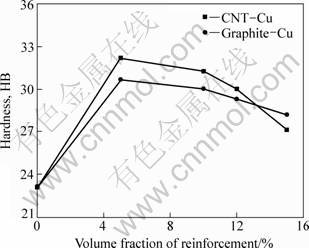 1) HB and thermal conductivity of CNTs-Cu composites are always larger than those of graphite-Cu composites when the reinforcement content is less than 15%. Whereas the reinforcement content reaches 15%, HB and thermal conductivity of CNTs-Cu composites are less than those of graphite-Cu composites.