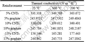 Table 1 shows thermal conductivity of the composites with various reinforcement contents. As can be seen, when the reinforcement content is low, thermal conductivity of CNTs-Cu composites at different temperatures is always larger than that of graphite-Cu composites. Whereas when the reinforcement content reaches 15%, thermal conductivity of CNTs-Cu composite is less than that of graphite-Cu composite. Moreover, as can be found in the table, thermal conductivity of the composite enhances along with the increment of temperature. This is because the existence of different atoms and interfaces induces heat transferring by phonon and holds the dominant status in the composite, which can be affected greatly by the change of temperature. Therefore, for the Cu matrix composites, higher temperature leads to higher thermal conductivity.