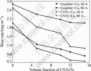 2) Friction coefficient and wear rate of the composites decrease with increasing the reinforcement content, and increase with the increase of electric current density. The effects of electric current are more obvious on tribological properties of graphite-Cu composites than on CNTs-Cu composites.