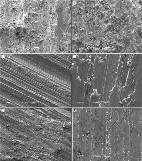 The worn micrographs of CNTs-Cu composite with 5% CNTs are shown in Figs. 7(c) and (d). It is noted that abrasive and adhesive wear with deep grooves happened on the surface of the CNTs-Cu composite. The impact of reinforcement is advancing with the increase of the CNTs content. As a result, those grooves disappear, for instance, the worn micrograph of CNTs-Cu composite with 10% CNTs, as shown in Figs. 7(e) and (f). Under the machining force, the abrasive scraps are produced by crashing and shearing around the contact area during the process of wear. In conclusion, from Fig. 7 it is obvious that the anti-friction and wear resistance properties of CNTs-Cu composites with electric current are better than graphite-Cu composites made by the same method.