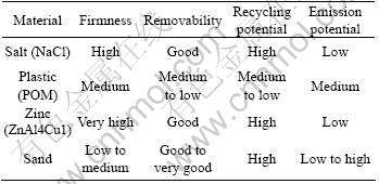 Cores are characterized by their production route, base core material and post cast fate. They can be removed from the cast part or remain in it. The subject of the present work is those types of cores removed, divided regarding their base matter. Four base materials are chosen to be tested: salt, plastic, sand and zinc based alloys. Table 1 lists a comparison of the top 4 properties of these materials regarding the testing procedures.