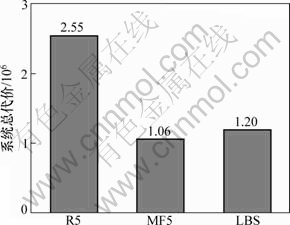 将随机选择副本位置的方法记为RS,结合访问频率的最小代价选择方法记为MFS,负载均衡的低代价选择方法记为LBS。经过50次模拟实验,求出各次数据访问总代价的平均值。上述3种方法产生的总代价平均值比较如图2所示。