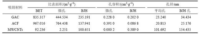 表2所示为3种碳系材料的比表面积、微孔面积、孔容、微孔孔容和孔径信息。从表2可以看出:ACF具有最大的比表面积、最大的孔容以及最小的平均孔尺寸。MWCNTs的团聚使其比表面积远低于GAC和ACF。此外,GAC和ACF均是微孔吸附剂,微孔面积对比表面积的贡献度分别达到53.22%和79.05%;MWCNTs则是介孔吸附剂,微孔面积对比表面积的贡献度仅为2.44%,这部分孔隙主要是由MWCNTs团聚体形成的疏松堆积孔。
