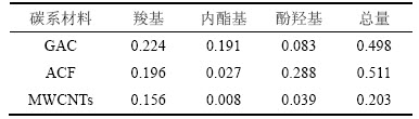 表3所示为3种碳系材料表面含氧官能团的含量。从表3可以看出:GAC和ACF表面的含氧官能团含量接近,GAC以羧基和内酯基为主,ACF以羧基和酚羟基为主。而MWCNTs表面的含氧官能团则相对较少,主要是羧基,羧基含量超过了总量的75%。由此可以推出,MWCNTs表面的疏水性强于GAC和ACF。