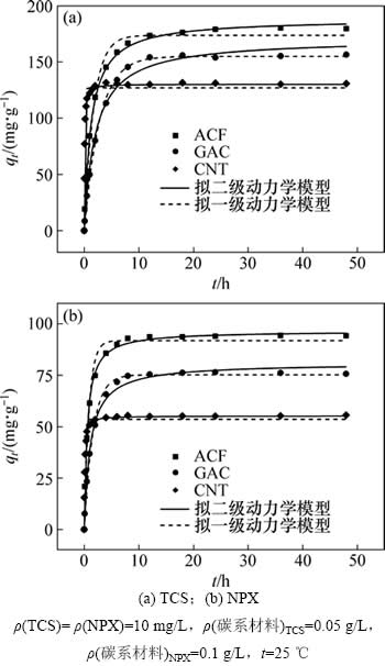 吸附过程的动力学研究主要用来描述碳系材料对目标污染物吸附速率,通过动力学模型对结果进行拟合,从而探讨其吸附机理。图2所示为3种碳系材料对TCS和NPX的吸附动力学曲线。从图2可知:3种碳系材料对TCS和NPX的吸附具有相似的趋势。TCS和NPX的吸附随着时间的延长而快速增加,随后达到吸附平衡。3种碳系材料的吸附能力从大至小依次为ACF,GAC和MWCNTs,ACF对TCS和NPX的平衡吸附量分别为173.61 mg/g和94.17 mg/g。由表2还可知:ACF具有最大的比表面积(967.016 m2/g)和最大的微孔孔容(0.391 0 cm3/g)。本研究选取的目标污染物TCS和NPX均为小分子有机物,更易于进入碳系材料的微孔中。而MWCNTs是一种介孔吸附剂,且相互之间的团聚大大降低了它的比表面积,这是MWCNTs吸附性能最低的主要原因。此外,3种碳系材料对TCS的吸附性能均强于NPX,这主要是因为3种碳系材料均为疏水型吸附剂,易于吸附水中疏水性强的有机污染物,而TCS(log Kow=4.76)的疏水性明显强于NPX(log Kow=3.18)。