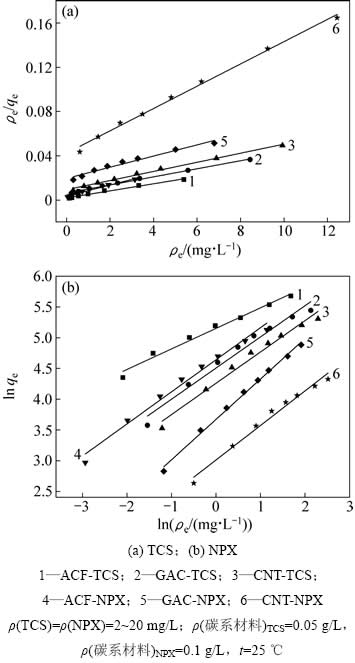 从Langmuir模型的拟合效果可以看出,模型的拟合程度从强至弱依次为:MWCNTs,ACF和GAC;常数KL与吸附能力有关,从KL来看,3种碳系材料的吸附能力从大至小依次为:ACF,GAC和MWCNTs。从KL还可以得出:3种碳系吸附材料对TCS的吸附性能明显优于NPX,而TCS的log Kow大于NPX的log Kow,说明3种碳系吸附材料更易于吸附疏水性强的有机物。而计算所得的RL(最大值为0.17)介于0~1之间,说明TCS和NPX在3种碳系材料表面上的吸附容易进行。而对于Freudlich模型,吸附指数n一般在0~10之间,在2~10之间表示吸附容易进行,小于0.5则表示吸附难以进行。另有研究表明:当n>1时,表示有利吸附;当n=1时,为线性吸附;n<1则不利于吸附[18]。从表5可以看出:当最小n>1.5时,表明3种碳系材料对TCS和NPX的吸附较容易进行,且属于有利于吸附,其中,ACF对TCS的吸附最容易进行。而从Kf可以看出:ACF的吸附性能最好,其次是GAC,而MWCNTs吸附性能最差。而3种碳系材料对TCS的吸附性能明显优于NPX。这与吸附动力学研究得到的吸附性能大小规律以及Langmuir模型拟合的结果完全一致。