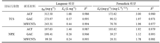 表5 3种碳系材料吸附TCS和NPX的吸附等温模型参数