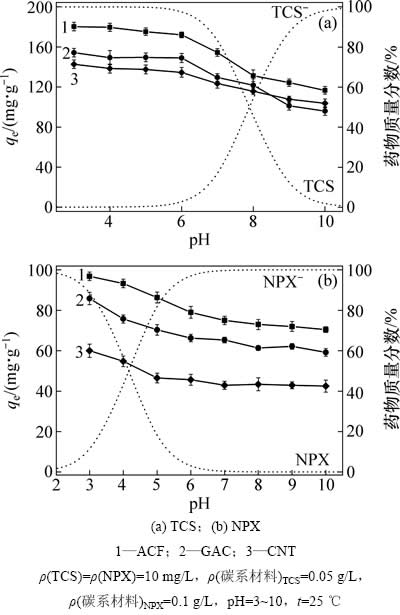 溶液pH对吸附剂的吸附性能起着重要的作用,它不但影响吸附剂的表面性质,而且影响吸附质在溶液中存在的物种形态。当溶液pH低于碳系材料的等电点时,碳系材料表面带正电荷;而当溶液pH高于碳系材料的等电点时,碳系材料表面带负电荷。图4所示为3种碳系材料在不同pH下的Zeta电位。从图4可见:在pH=3~10,3种碳系材料的Zeta电位均随着pH升高而降低,ACF,GAC和MWCNTs的等电点分别为3.50,3.31和5.22。图5所示为pH对3种碳系材料吸附TCS和NPX的影响。图5中虚线表示TCS和NPX的物种质量分数与pH的关系。从图5可知:对于TCS,当pH>7.9时,TCS主要以阴离子物种(TCS-)的形式存在;而当pH<7.9时,TCS则主要以中性物种(TCS)的形式存在。对于NPX,当pH>4.15时,NPX主要以阴离子物种(NPX-)的形式存在;而当pH<4.15时,TCS则主要以中性物种(NPX)的形式存在。图5中实线则表示pH对3种碳系材料吸附TCS和NPX的影响。从图5可知:对于TCS,当6<pH<10时,3种碳系材料对TCS的吸附量均明显降低;而对于NPX,当3<pH<6时,3种碳系材料对NPX的吸附量同样明显下降。这一现象可以通过比较溶液的pH、吸附质的pKa和碳系材料的等电点来解释。以TCS为例,当pH>6时,3种碳系材料的表面均带负电荷,而溶液中阴离子物种(TCS-)的吸附量随着pH增大而逐渐增多。因此,静电排斥力占主导作用,导致3种碳系材料对TCS的吸附量降低。而当pH<6时,溶液中的TCS以中性物种(TCS)的形式存在,此时静电排斥力消失,TCS的吸附量随之增大。ZHOU等[19]在考察pH对TCS在MWCNTs表面吸附性能影响时,也观察到相同的现象。相似的情况也发生在3种碳系材料对NPX的吸附过程中。
