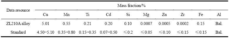 ZL210A铸造铝合金是我国铸造工作者在俄BA10合金的基础上成功研制出的一种适合我国国内生产应用的典型的可热处理强化的高强度铸造Al-Cu-Mn系铝合金,热处理对其力学性能有着决定性的影响[1]。ZL210A合金不含Ag和V等稀贵金属,对杂质限量也较ZL205A等合金宽,在保证合金性能的同时,降低了对金属原材料的要求,简化了生产工艺,具有很高的经济价值[2-4]。目前,ZL210A合金已实际用于生产飞机、导弹上的一些关键受力构件,如支架和壳体等。