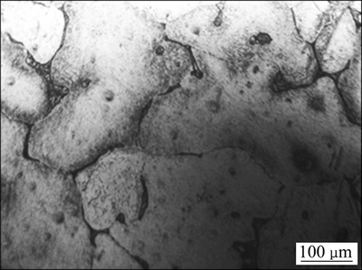 图1所示为740 ℃浇注的ZL210A合金铸态的金相组织。由图1可以看出,合金的铸态组织主要由晶内及晶界一些粗大析出相和断断续续的共晶网状组织构成。根据Al-Cu-Mn三元合金相图可知,在平衡条件下,合金结晶过程为:先结晶出α(Al),然后发生L→α(Al)+Al6Mn二元共晶,最后发生L+Al6Mn→ α(Al)+T(Al12CuMn2)包共晶反应。Cu溶入基体中不会出现θ相,所以在平衡结晶条件下铸态组织主要为α相和T相。但在实际情况下,合金发生不平衡结晶,Cu不能全部溶入基体中,在发生包共晶反应之后,仍然会有液相存在,并且液相中的Cu含量很高,会发生L→α(Al)+θ(Al2Cu)+T(Al12CuMn2)三元共晶反应。因此,实际情况下的铸态组织包含α(Al)、θ(A12Cu)和T(Al12CuMn2)相[11-12]。浇注温度为740 ℃时,铸态合金拉伸试样的抗拉强度(σb)、屈服强度(σ0.2)、硬度(HV)和伸长率(δ)分别为187 MPa、65 MPa、62 HV和6.5%。