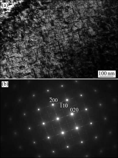 图3所示分别为70 ℃淬火处理试样的明场相图和和对应选区的SAED谱。由图3(a)可以看出,合金基体中析出了大量长条状的呈方向性垂直排列的析出相,因为θ′相是与基体α(Al)相呈(100)θ′//(100)α,[100]θ′//[100]α垂直排列的取向关系,所以70 ℃淬火处理试样的组织中析出的大量的呈方向性垂直分布的析出相是θ′相。另外,从图3(a)还可以看出,合金基体中除了析出大量的θ′相之外,组织中还包含有许多弥散分布的小黑点,这些小黑点可能是时效过程中析出的GPⅠ区和GPⅡ区(θ″相)。图3(b)所示为图3(a)对应的SAED谱,由图3(b)可以看出,图中的衍射斑点附近有断断续续的条纹特征,这是θ′相SAED谱的典型特征。经标定,图3(b)中较亮的衍射斑点为α(Al)在 (001)面的衍射斑点,较暗的衍射斑点为θ相在