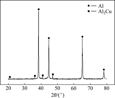 图4所示为经过30 ℃水温淬火试样时效态的XRD谱。由图4可知,30 ℃水温淬火后的试样组织中含有α(Al)相和θ(Al2Cu)相,由于合金中Mn元素含量较少,因此,并未检测出T(Al12CuMn2)相。