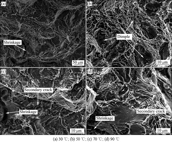 2) 不同淬火水温试样的拉伸断口都有大小不等的韧窝存在,由拉伸断口还可以看出,试样还存在缩孔和二次裂纹缺陷。淬火水温为50 ℃的试样拉伸断口 韧窝尺寸较大且深,塑性最好。