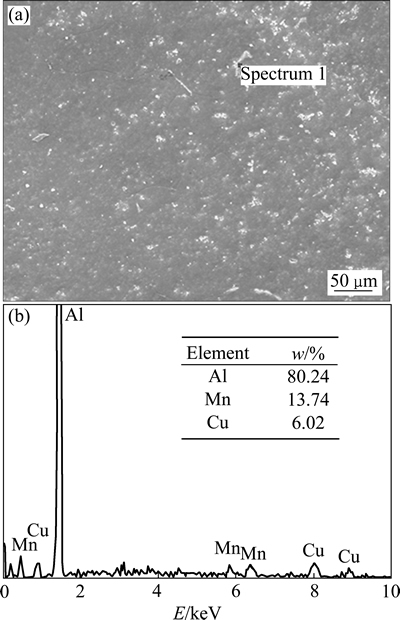 图6所示为经30 ℃水温淬火后时效态试样的SEM像及EDS分析结果。由EDS分析可知,图6(a)中打点处的元素成分为Al、Mn和Cu,其摩尔分数分别为80.24%、13.74%和6.02%,结合扫描电镜中相的形貌及EDS分析可知,图中打点处的成分确定为T(Al12CuMn2)相。