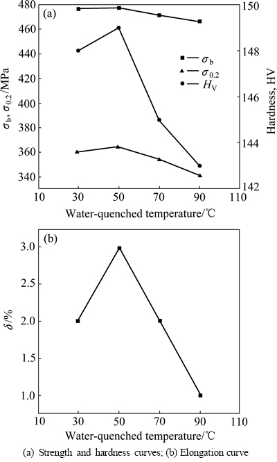 Fig. 7 Effect of water-quenched temperature on mechanical properties of aging ZL210A alloy