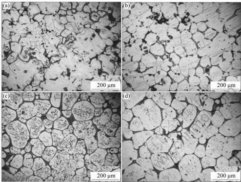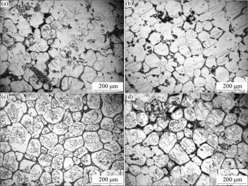Fig.4 Optical micrographs of as-cast AZ91D magnesium alloy partially remelted at 550 ℃ (a), 560 ℃ (b), 565 ℃ (c) and 570 ℃(d) for 10 min