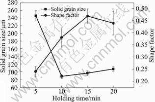 Fig.3 Variation of grain size and shape factor with isothermal holding time for as-cast AZ91D magnesium alloy during partial remelting